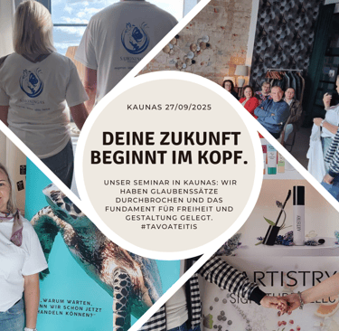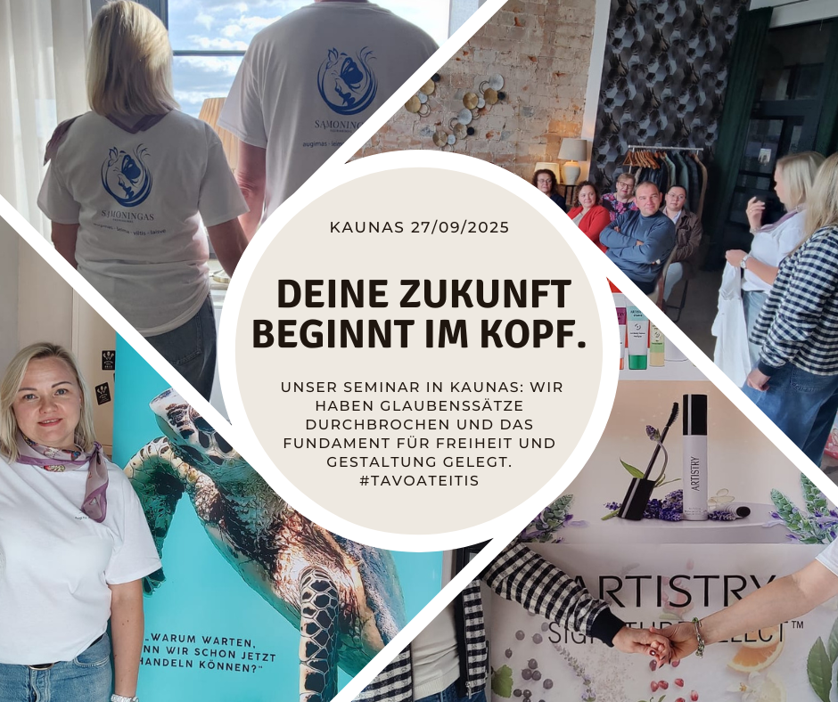Unser Seminar „Tavo Potentials, tavo ateitis, kartu“ (Dein Potenzial, deine Zukunft, gemeinsam) in der Drobės fabrikas in Kaunas war eine Einladung zum Mindset-Wechsel: vom Zeit-gegen-Geld-Tausch zur Gestaltung der eigenen Ziele und Visionen. Die Kernaussage: Wir zeigten, wie freies Unternehmertum der Weg zu persönlicher Entfaltung und Freiheit sein kann. Das diskutierte MLM-Konzept erfüllt dabei zwei neurologische Grundbedürfnisse: * Verbundenheit: Durch eine unterstützende Gemeinschaft. * Gestaltungsbedürfnis: Durch die Freiheit, das Geschäft individuell auszurichten. Ein wichtiger Fokus lag auf der Identifizierung und Überwindung von limitierenden inneren und äußeren Glaubenssätzen, die uns von notwendigen Veränderungen abhalten. Die Gründungsidee dieses Weges, basierend auf den Prinzipien Freiheit, Familie, Hoffnung und Anerkennung, stellt den Menschen in den Mittelpunkt. Die Einladung: Das Seminar war eine Inspiration, den eigenen Mindset kritisch zu hinterfragen und sich der persönlichen Entwicklung zu widmen. Wir laden dazu ein, gemeinsam zu wachsen und diesen Weg des freien Unternehmertums zu beschreiten. Bist Du bereit, Deine limitierenden Glaubenssätze abzulegen?